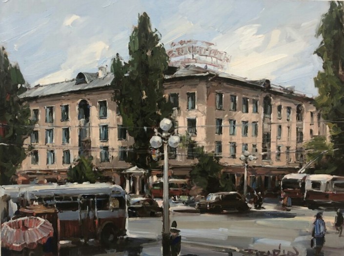 "Здесь частично представлены работы, сделанные на основе архивных материалов, переведенные в цвет и с попыткой воссоздать и живописной техникой, и колористической атмосферу середины прошлого века. Мне по натуре близок исторический подход. Я антиквар в душе. Мне очень нравится старая Алма-Ата. Она построена в 30-е годы по центральному генплану, моя родина - северный Павлодар, он построен так же, но только на 25 лет позднее. Эта эпоха оставила яркий след в архитектуре. Многие сооружения не сохранились в таком варианте, который был бы привлекателен, либо их просто нет. Существуют архивные фотографии, здания, которых уже нет, как, например, кинотеатр "Алатау". Это первый кинотеатр, конец 40-х годов. Хочется передать ту атмосферу живописным способом. Не только передать изображение объекта, который был и которого уже нет, а эмоционально войти в воздух того времени", - рассказывает художник.