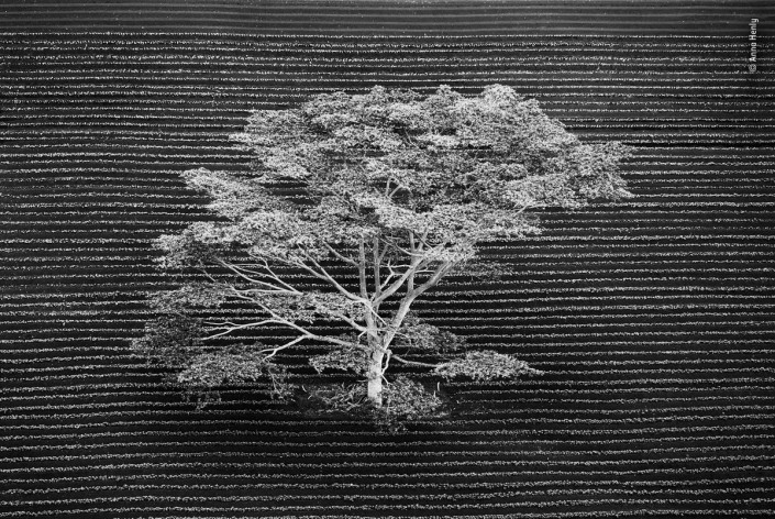 Дерево, снятое с вертолета, стоит в поле возле тропического леса. Остров Кауаи, Гавайи.