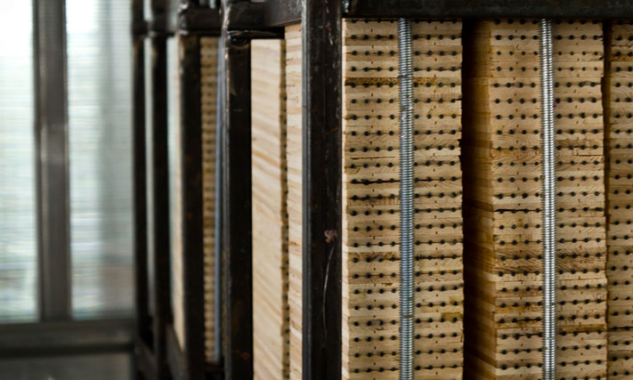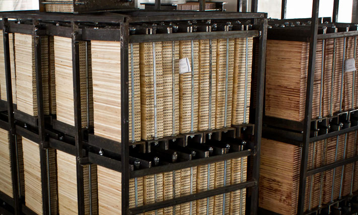 Затем откалиброванные дощечки помещают в автоклав. По своему внешнему виду он напоминает бочку, к которой подведено множество труб разного диаметра. При помощи этих труб в камере можно создавать вакуум, нагнетать давление и подавать внутрь всевозможные растворы. В результате этих процессов из дощечки удаляются содержащиеся в ней смолы, и древесина импрегнируется (пропитывается) парафином. На сегодняшний день это не самый простой, но один из самых эффективных способов улучшить важные свойства материала и защитить дерево от вредного воздействия окружающей среды.