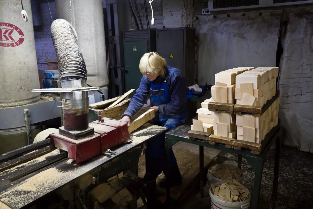 Производство карандашей начинается с лесной биржи, где складируется заготовленный кедр. Сейчас здесь находится больше трех тысяч кубов дерева. В прошлом году областные власти очень помогли фабрике в обеспечении материалом и в этом году здесь планируют произвести около 85 миллионов карандашей.