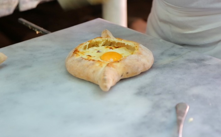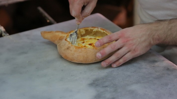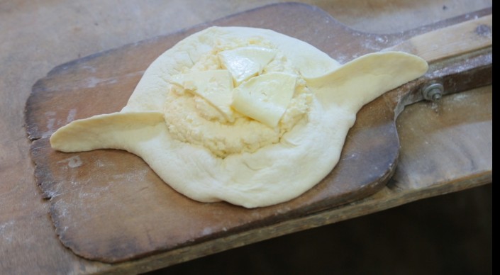 6. В середину лодочки накладываем начинку и кладем 2-3 кусочка сулугуни. И в печь на 5 минут. Кстати, в Батуми в ресторанах имеются самые что ни на есть настоящие печи на дровах, что придает особый вкус и запах этому кулинарному шедевру.