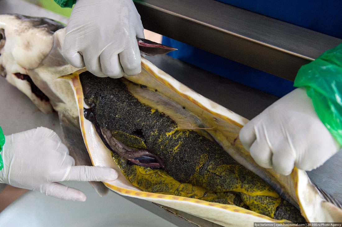 Если рыба предназначена на убой, она получает по голове молотком. Потом удаляются жабры, и осетр подвешивается за хвост, чтобы стекла вся кровь. Затем она уходит в переработку.