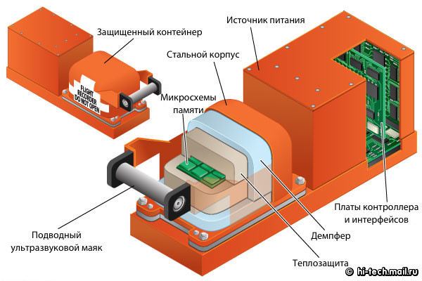 Кстати, что касается падения в воду: самописцы оснащаются ультразвуковыми маяками, включающимися при контакте с водой. Маяк излучает сигнал на частоте 37 500 Гц, и, запеленговав этот сигнал, самописец легко найти на дне, откуда его извлекают водолазы или дистанционно управляемые роботы для подводных работ. На земле самописец найти также несложно: обнаружив обломки самолета и зная места размещения самописцев, достаточно, по сути, просто оглядеться вокруг.