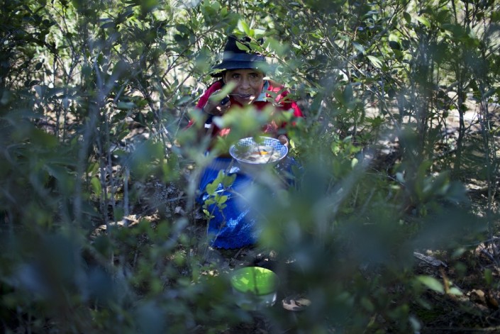 64-летняя Андреа Муча обедает во время перерыва. Андреа работает вместе с сотнями других мужчин, женщин и детей в районе по сбору листьев коки №1.