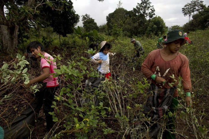 Молодые люди накрывают листья коки брезентом, чтобы они просушились. Владельцы плантаций продают оптовикам килограмм листьев коки за 3,5 доллара, а те поставляют их наркоторговцам. Это в два раза больше, чем зарабатывают фермеры, выращивающие кофе или какао.