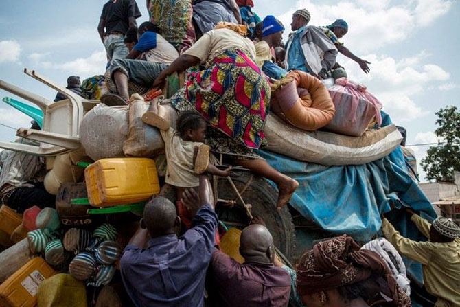 Мусульмане взбираются на грузовик в анклаве PK5 в Банги в надежде уехать в более безопасное место, 1 апреля 2014 года. Они несколько часов прождали под палящим солнцем, но автомобиль так и не сдвинулся с места.