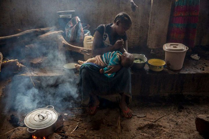 Христианка, нашедшая приют в католической миссии, кормит своего ребенка в Гримари.