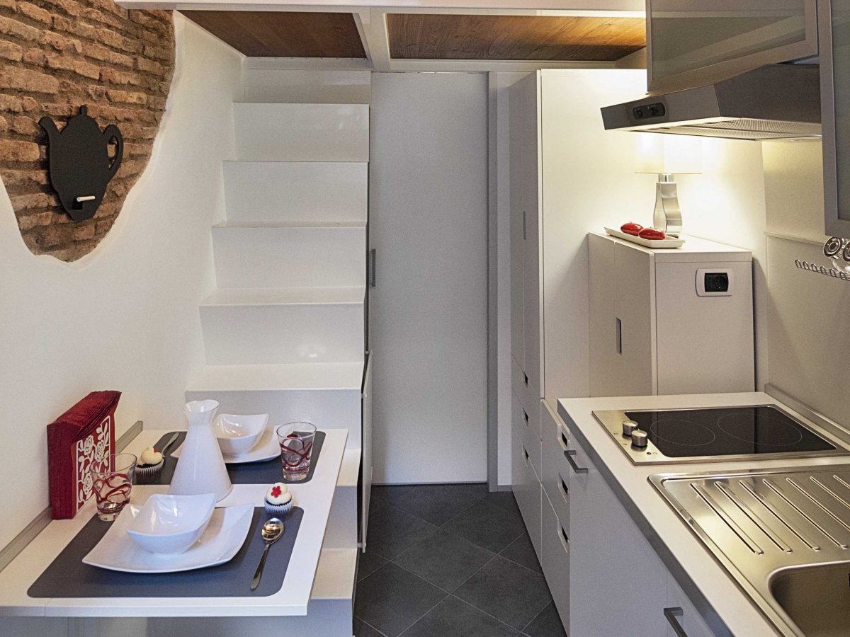 На первом этаже расположена полностью оборудованная кухня и ванная комната с душем. За столом, который откидывается, чтобы не занимать место, одновременно может поместиться 3-4 человека.