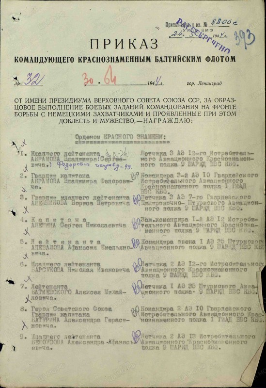 Через три недели Александр сбил еще три самолета, направлявшихся к Ленинграду. Тогда Указом Президиума Верховного Совета СССР от 23 октября 1942 года за образцовое выполнение боевых заданий командования на фронте борьбы с немецкими захватчиками и проявленные при этом мужество и геройство ему присвоено звание Героя Советского Союза с вручением ордена Ленина и медали "Золотая Звезда".