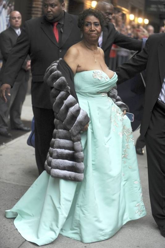 Королева соул-музыки Арета Франклин, обладающая уникальным голосом, но не самым изысканным вкусом, выбрала для своего появления на телешоу платье-бюстье Tiffany, верхняя часть которого едва сдерживала рвущуюся на волю грудь.