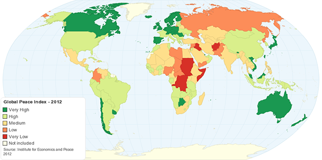 Годом ранее, в 2012-м, Институт мира, Центр мира и Сиднейский университет оценили обстановку в разных государствах по 22 параметрам, которые учитывали как внутренние факторы (уровень насилия, преступность и др.), так и внешние: международные отношения, расходы на военные нужды и так далее. В пятерку самых миролюбивых стран вошли Исландия, Новая Зеландия, Дания, Канада и Япония. Казахстану досталось 93 место из 158-ми возможных. Самыми агрессивными странами были признаны Сомали, Афганистан, Ирак, Судан, КНДР, Демократическая Республика Конго и Россия.