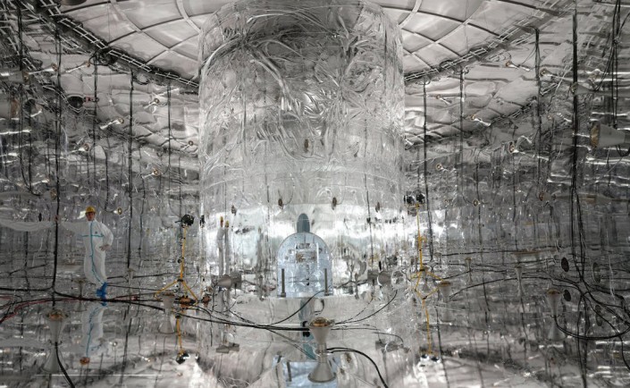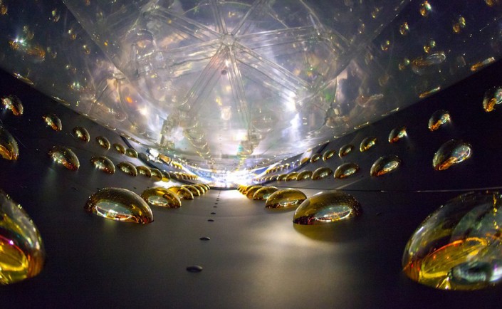 Нейтрино-эксперимент проходит сразу в трех огромных залах, захороненных на холмах Дайя-Бей, Китай. Шесть цилиндрических детекторов, каждый из которых содержит 20 тонн жидкого сцинтиллятора, сгруппированы в залах и окружены 1000 ФЭУ. Они тонут в бассейнах чистой воды, блокирующей любую окружающую радиацию. Соседняя группа из шести ядерных реакторов штампует миллионы квадриллионов безвредных электронных антинейтрино каждую секунду. Этот поток антинейтрино взаимодействует с жидким сцинтиллятором, чтобы излучать короткие вспышки света, которые подхватываются ФЭУ. Дайя Бэй построен для исследования осцилляции нейтрино.