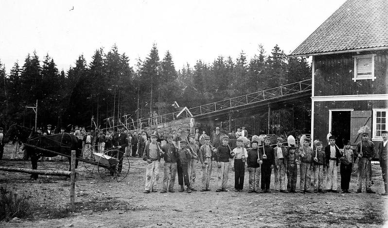 Заключенный (с бензопилой) работает с охраной в лесу на острове Бастой.