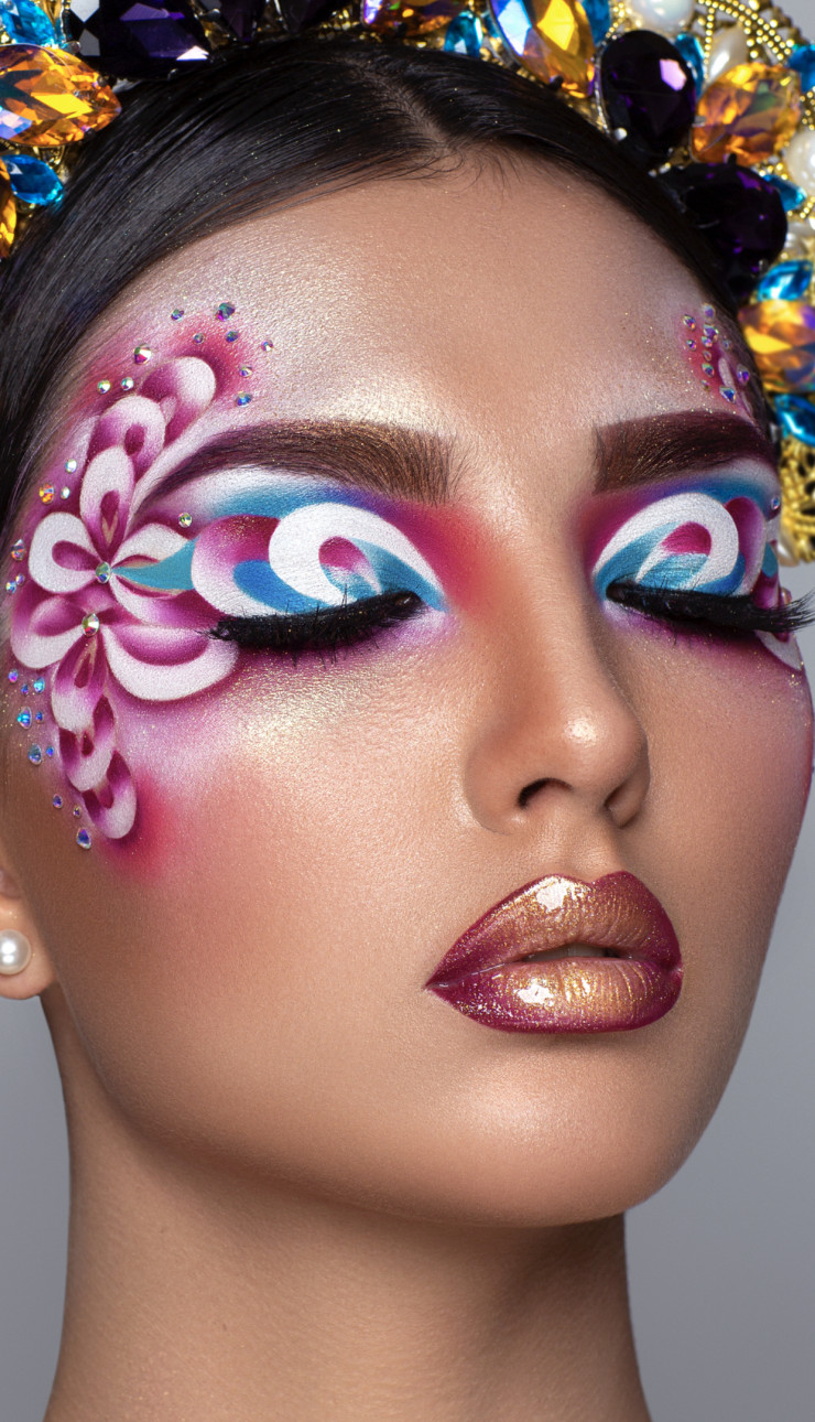 "На чемпионате мира по макияжу было шесть номинаций, можно было участвовать в любой из них и сделать по критериям заданную работу. Одна из моих номинаций включала рисунок на лице. Этот вектор я сравниваю с яйцами Фаберже, то есть она должна быть очень точной и детальной работой, яркой в цвете, симметричной в пропорциях на две половины лица, глаз должен быть красиво оформлен с рисунком, со сложными техническими элементами.