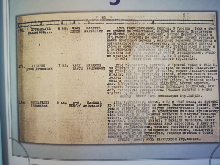 Документы написаны кратко и по делу. Сухие строчки не передают все эмоции, который мог испытывать молодой воин. Из списка курсантов Фрунзенского военного пехотного училища, датированного 16 сентября 1943 года, мы узнаем, что Рахимжан Кошкарбаев был зачислен в четвертую строевую роту вместе с 75 другими молодыми людьми, которых училище "получило из Казахстана". Еще один документ из училища за октябрь 1944 года дает краткую характеристику курсанту.