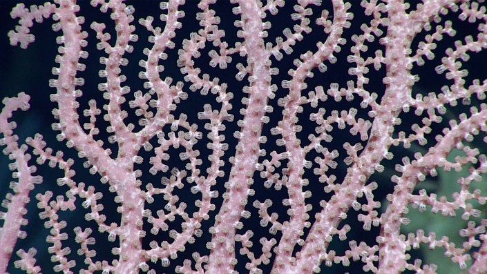 На глубине 2400 метров ученые обнаружили прекрасное существо - розовый коралл Hemicorallium с самой разветвленной структурой.
