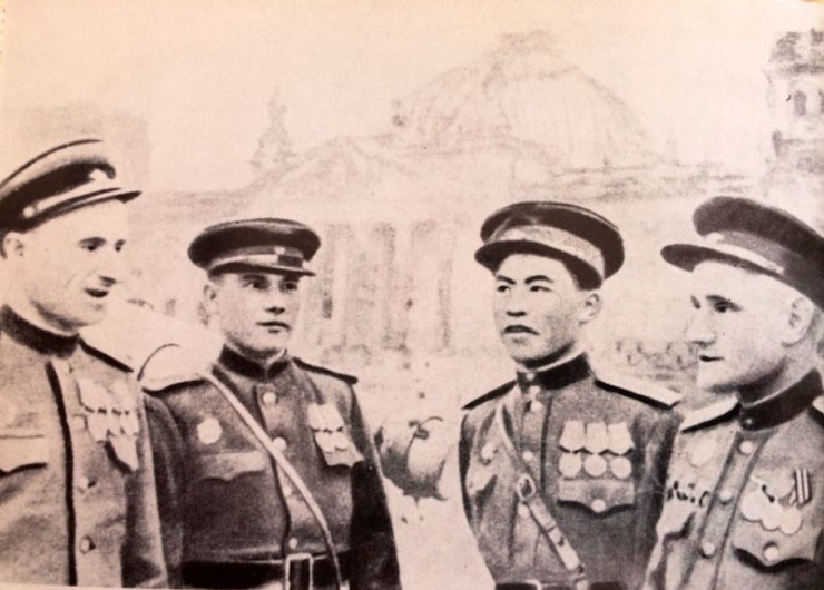 На фото слева направо: младший сержант М. Кантария, сержант М. Егоров, лейтенант Рахимжан Кошкарбаев, капитан С. Неустроев