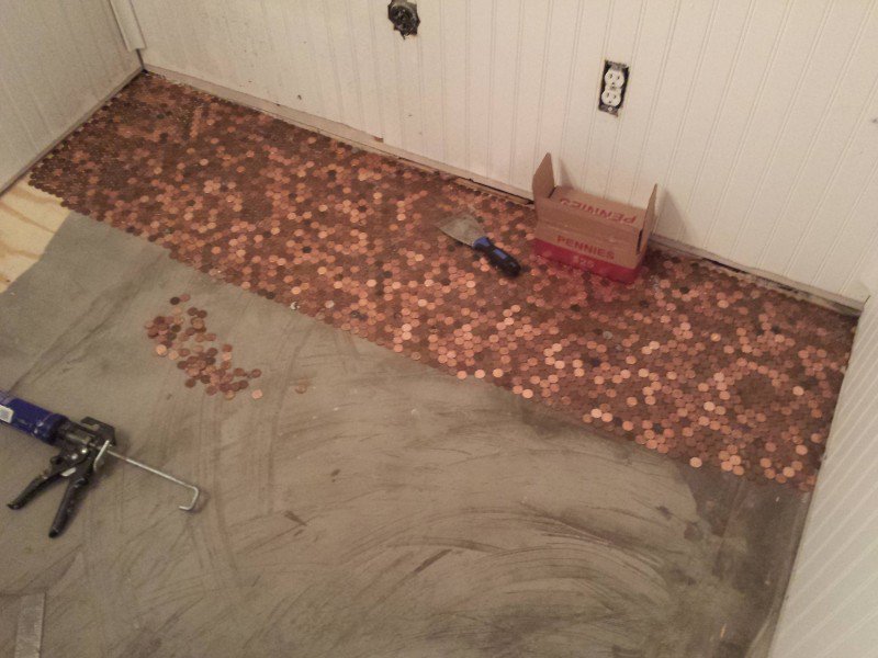 Прежде всего нужно собрать достаточное количество одинаковых монет. Чтобы отделать пол небольшой комнаты, понадобится большое ведро, полное монет. Затем необходимо нанести клейкую основу на поверхность. Пистолет с картриджем бесцветного силиконового клея - самый лучший вариант из всех.