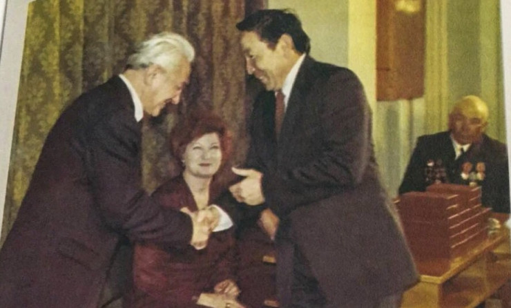 Министр образования СССР Г.А.Ягодин и зам.Председателя СовМина КазССР М.М.Ахметова с членом-корреспондентом АН КазССР Е.Е.Ергожиным, 1987 год.