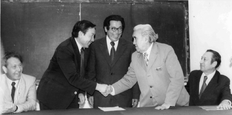 Президент АН КазССР Аскар Кунаев вручает госпремию КазССР в области науки и техники научному руководителю работы Едилу Ергожину, 25 января 1983 года