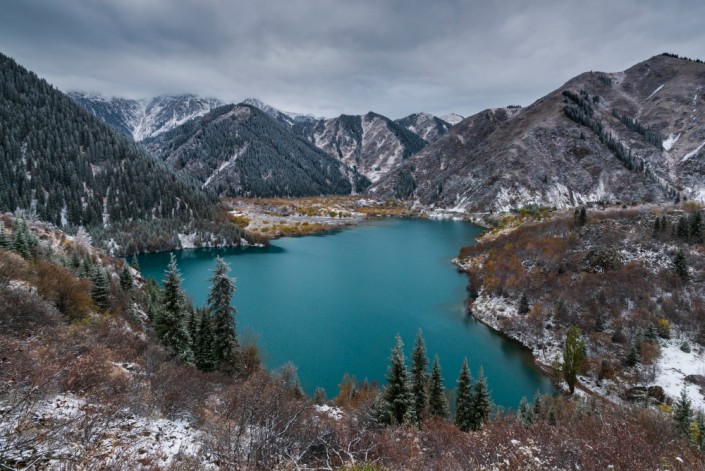 Озеро Тузколь, Алматинская область. Вид на пик Снежного Лотоса (6627 м), Тянь-Шань, Китай. Ноябрь, 2017 год. © Ольга Кулакова.