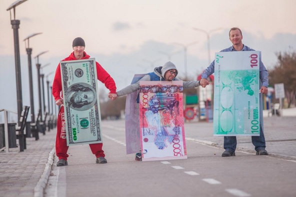 Также автор опубликовал одно фото со съемок видеоролика. Снимок пародирует знаменитую сцену из кинофильма "Кавказская пленница". В нашем варианте в главных ролях - доллар, тенге и евро.