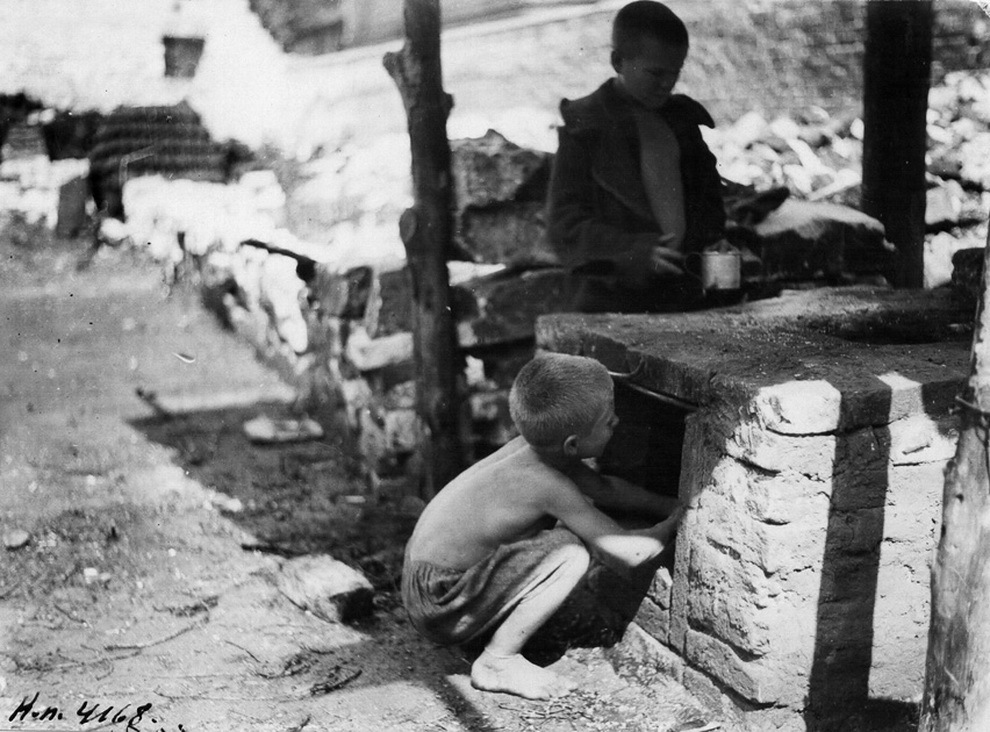 Двое беспризорников на улице у печи. Шаболовский детский дом. Москва, 1925 год