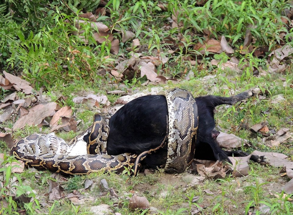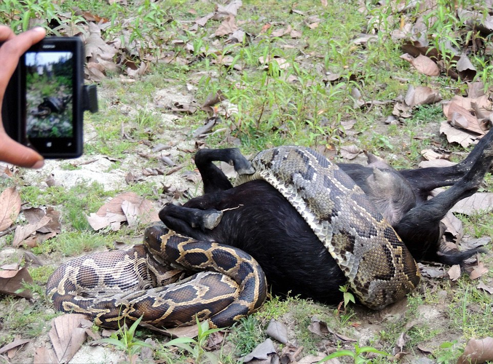 Драматические кадры из жизни дикой природы удалось снять индийскому фотографу Рони Чоудхури в заповеднике в штате Западная Бенгалия. Гуляя в лесу, мужчина наткнулся на толпу селян, собравшихся в круг и что-то громко обсуждавших. Подойдя ближе, фотограф увидел питона, который медленно поглощал только что пойманную домашнюю козу.