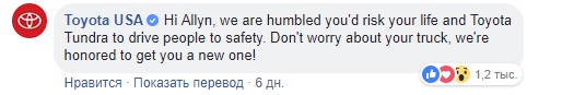 Компания Toyota увидела пост Аллина и ответила ему, что искренне восхищается им и его поступком ради спасения жизней других. "За внедорожник не переживай, для нас честь подарить тебе новый!"