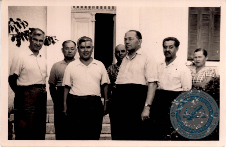 Ермухан Бекмаханов (в центре слева) с писателями и учеными, 1959 год. © ЦГА РК