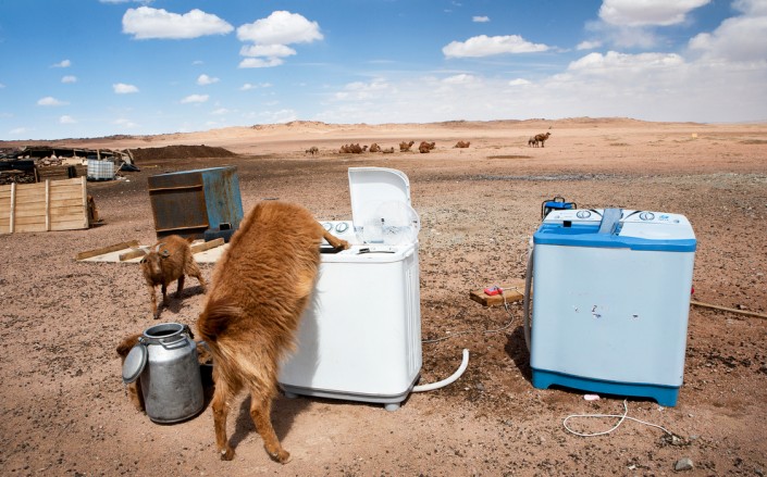 Изнемогающая от жажды коза в пустыне Гоби пьет воду из стиральной машины. Наряду с выпасом, местные семьи работают в шахтах, чтобы обеспечить дополнительный доход на солнечные панели, стиральные машины.