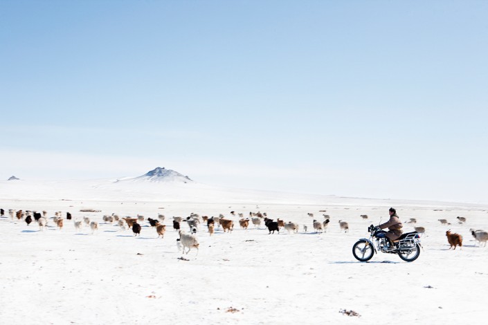 Монгольский пастух выезжает забрать с пастбища свой скот во время сильной метели.
