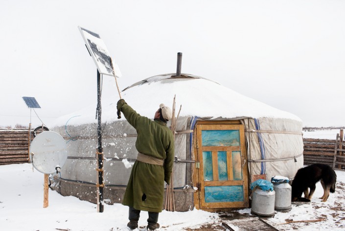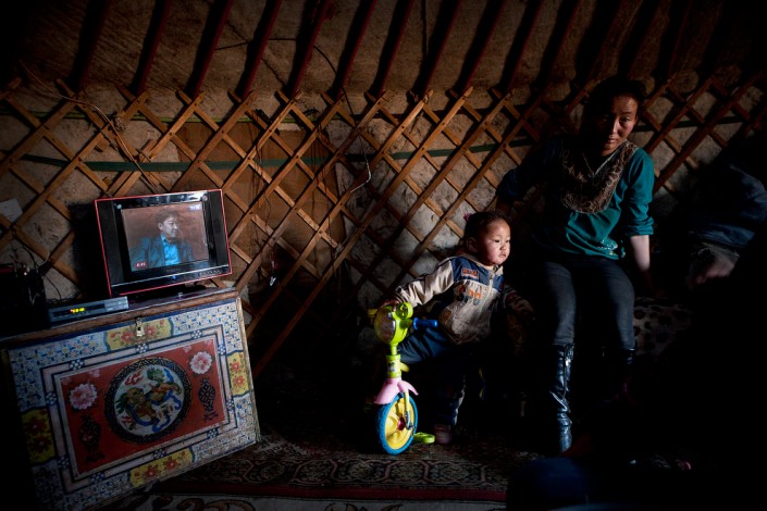 Кочевая семья в своей юрты. У таких семей есть телевизоры, DVD-проигрыватели, мобильные телефоны; для зарядки используются солнечные панели.