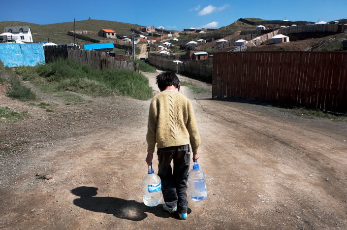 Монгольский мальчик несет домой бутыли с водой.