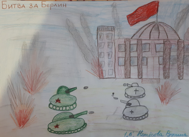 "Битва за Берлин была одной из последних операций, которая продолжалась с 16 апреля по 8 мая 1945 года. В ходе этой операции советские войска с огромным трудом вошли в город. Оборона Берлина была очень хорошо продумана и подготовлена. Бои шли за каждый дом, за каждую улицу! Они не прекращались ни ночью, ни днем.  В городе было собрано большое количество орудий, минометов, "Катюш" и танков. И благодаря накопленному опыту и превосходству в силе советские войска смогли приблизиться к Рейхстагу. К зданию пытались пробиться очень много штурмовых групп. К вечеру 30 апреля два героя - Рахимжан Кошкарбаев и Григорий Булатов смогли под непрекращающимся обстрелом пробиться к зданию и водрузить знамя! К утру 2 мая гарнизон Рейхстага капитулировал. Берлинская операция нанесла последний сокрушительный удар по войскам противника, и спустя шесть дней после падения Берлина германское руководство подписало акт о безоговорочной капитуляции Германии".