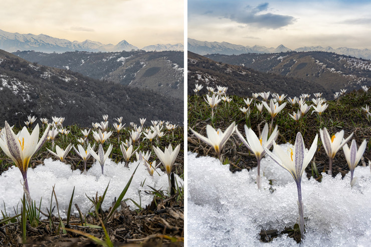 "Подснежников в этом году было много в начале марта, тогда мне удалось сделать хорошие фото. Но после пришедших дождей и холодов их стало меньше, они закрылись и прилегли на землю. А видео-таймлапс я снял 21 марта, поймал момент с более-менее подходящей погодой", - добавил он.