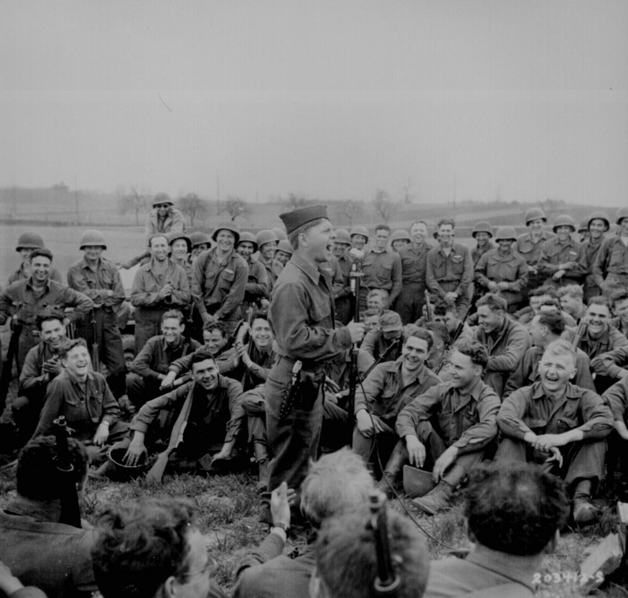 Американский комик Микки Руни выступает перед солдатами 44-го дивизиона, Кист, Германия, 13 апреля 1945 года.