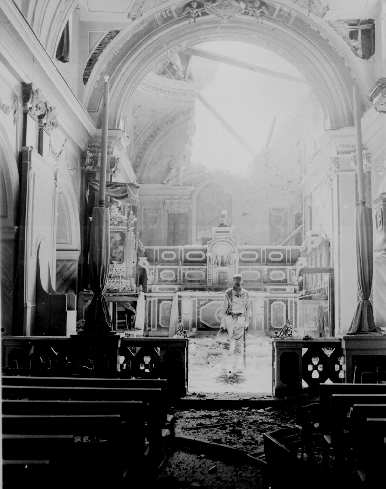 Солдат стоит перед алтарем в разрушенной католической церкви, Италия, 23 сентября 1943 года.