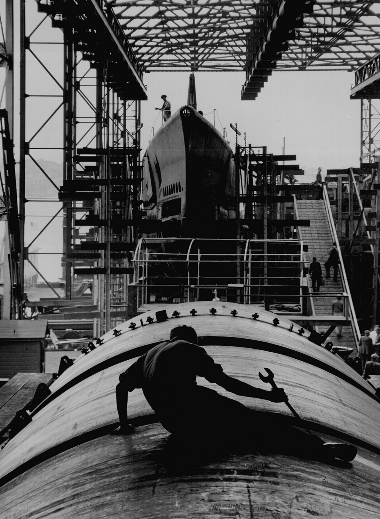 Мужчина, работающий на корпусе подводной лодки компании Electric Boat, Гротон, Коннектикут, август 1943 года.