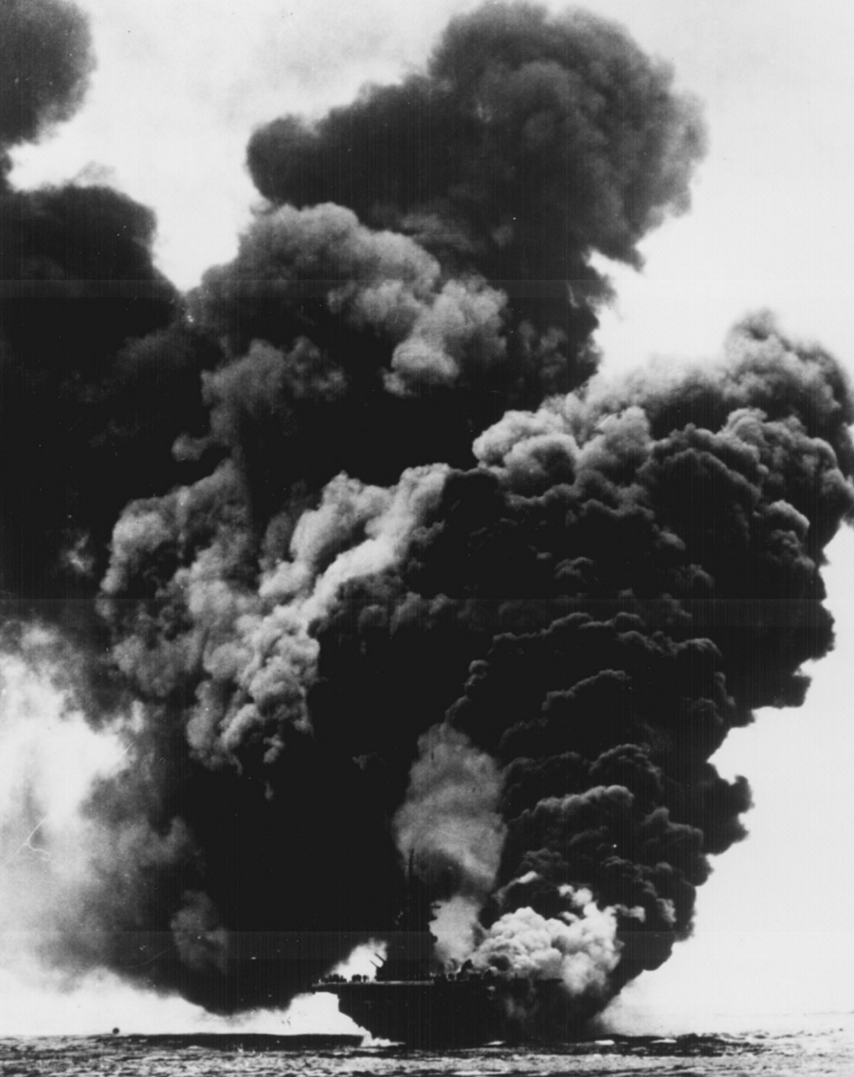 Пылающий американский авианосец "Банкер-Хилл" в результате атаки камикадзе близ Окинавы, 11 мая 1945 года.