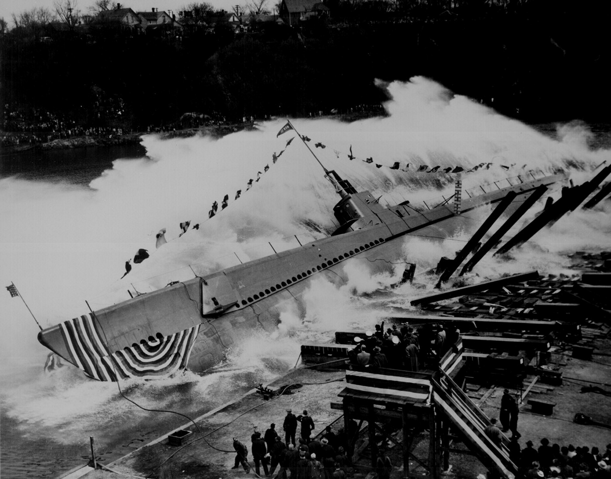 Спуск на воду американской подводной лодки Robalo компании Manitowoc Shipbuilding, Висконсин, 9 мая 1943 года.