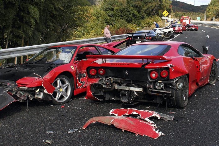 Суперкары - тоже машины, и ничто автомобильное, вроде обыкновенной дорожной аварии, им не чуждо. Но в случаи, вроде этого, верится с трудом - в 2011-м на мокрой дороге в Японии столкнулось аж 14 машин, девять из которых - суперкары. Во всяком случае, были ими.