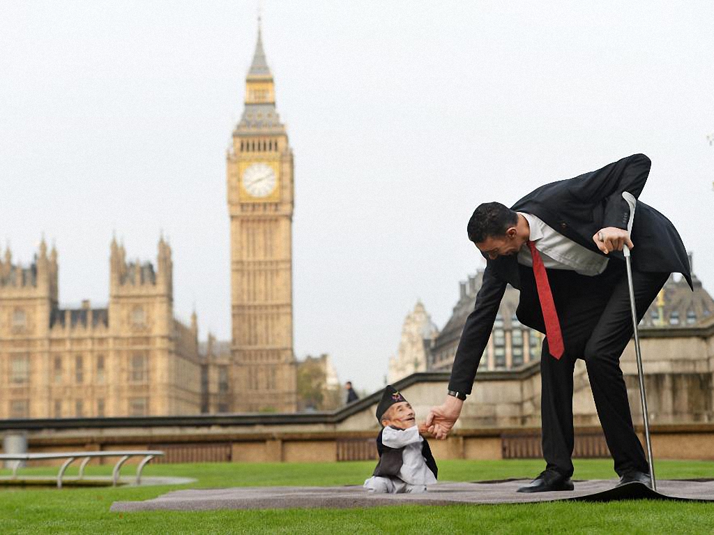 Самый низкий и самый высокий человек в мире встретились в Лондоне по случаю проведения фотосессии для Книги рекордов Гиннесса. Фотография Султана Кесена - самого высокого человека в мире рядом с Чандрой Бахадуром Данги - самым низким человеком в мире выглядит очень трогательно.