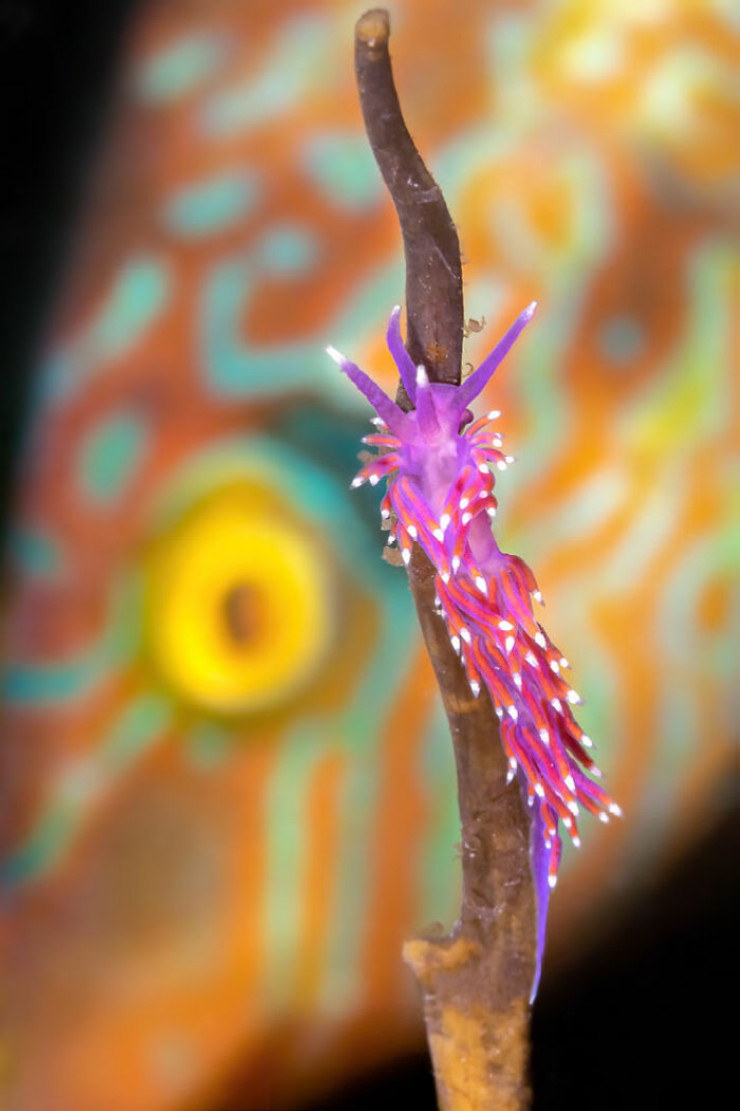 "Пробковый губан, которого вы видите на заднем плане, был занят строительством гнезда под пирсом. Он регулярно возвращался в одно и то же место, чтобы добавить больше собранных кусочков морских водорослей. А голожаберный моллюск в это же время пробирался вдоль ближайшего куска водорослей, и мне пришлось подождать всего пару минут, прежде чем он пробился вверх по стволу водоросли, что позволило мне сделать несколько снимков как раз в тот момент, когда губан и голожаберный были в одном кадре".