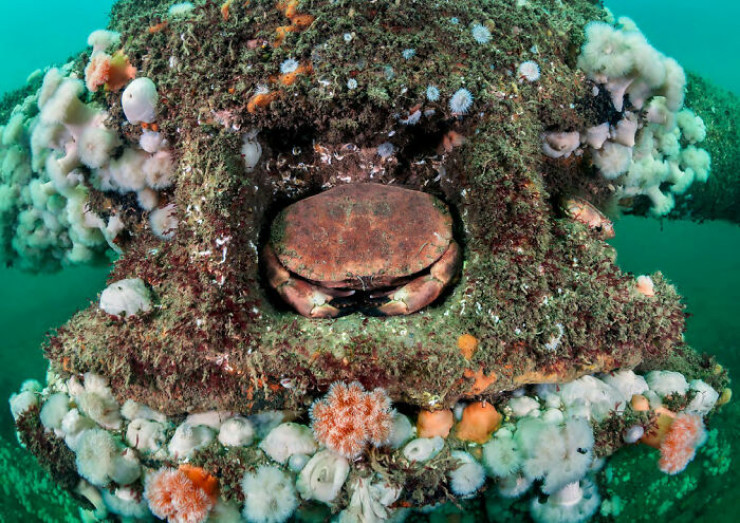 "Во время погружения на корабль SS Rosalie, затонувший у побережья Вейборна в Англии, я заметил этих двух коричневых крабов. Вероятно, они завершили важную часть своего жизненного цикла - спаривание, и самец наверху защищал самку, находящуюся внизу, пока ее экзоскелет не затвердел. Мне было приятно наблюдать и запечатлеть это особое поведение с помощью широкоугольного объектива".