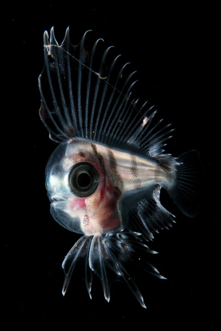 "Я наткнулся на эту однодюймовую личиночную крылатку ночью у побережья Флориды во время погружения. Окраска этой особи была красивее, чем обычно, и поэтому я решил попытаться запечатлеть ее плавники в полной мере. Это сложная задача не только потому, что они избегают яркого света и обычно пытаются убежать, но также потому, что они очень редко и только на короткие промежутки времени полностью раскидывают плавники в защитной позе. Мне очень повезло, что я смог запечатлеть ее во всей красе".