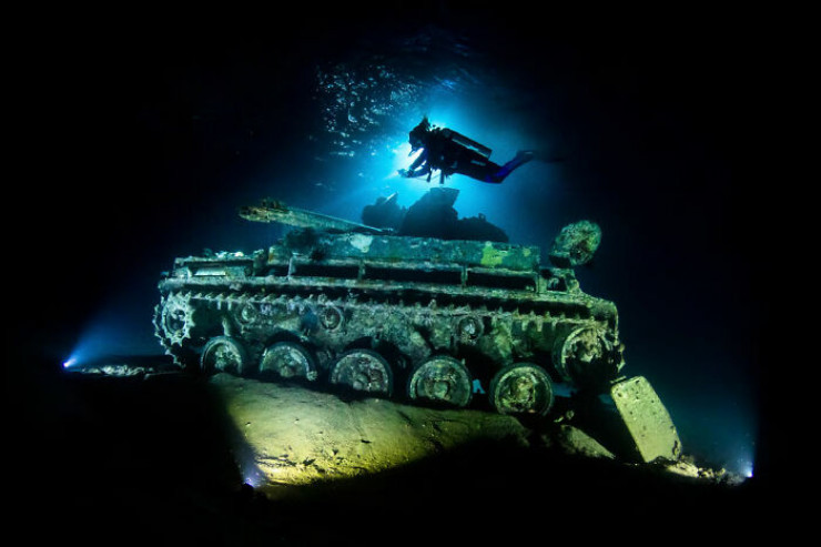 "Был вечер, и солнце садилось над засушливым ландшафтом самого южного города Иордании, Акабы. Я и группа подводных фотографов с нетерпением ждали наступления ночи, чтобы мы могли войти в воду и начать исследовать огромное количество военной техники, которая была специально затоплена для дайверов. Мы использовали комбинацию мощных внешних источников света, чтобы осветить танк и водолаза".