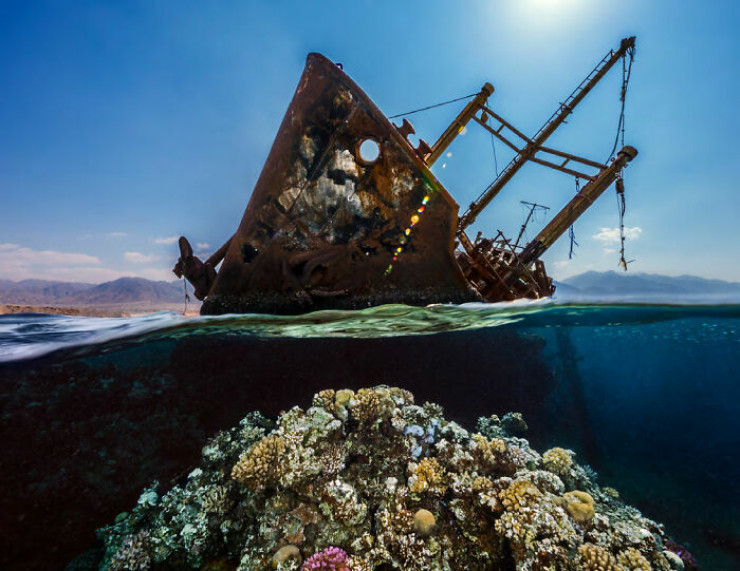 "Этот снимок кораблекрушения Георгиоса был сделан в Неоме, Саудовская Аравия, вдоль залива Акаба в Красном море. В 1978 году это большое грузовое судно, пришедшее из Англии, ночью застряло на мелководном коралловом рифе, а затем пострадало от большого пожара. Теперь этот корабль служит искусственным рифом для многих морских организмов. Он высовывается наполовину из воды с носовой стороны. Некоторые местные жители называют это место саудовским "Титаником".