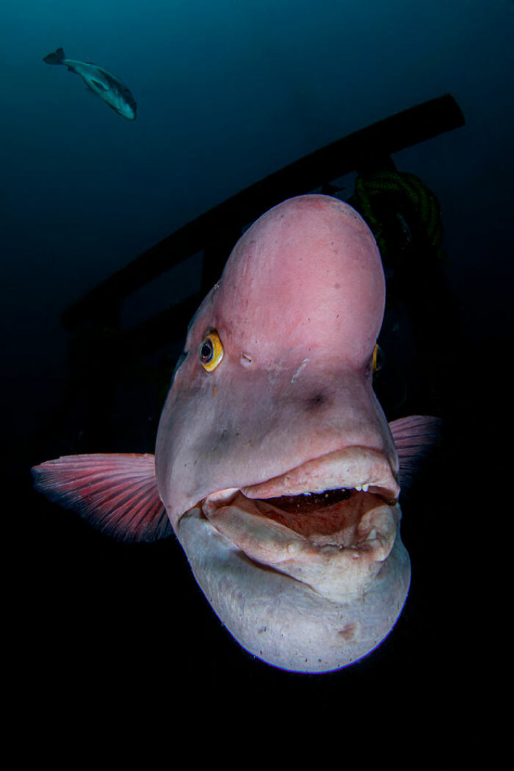 "По мере того как азиатский губан становится старше, он меняет пол с самки на самца, и в то же время у него появляется большая шишка на голове. Я подумал об освещении и композиции, чтобы изображение шишки и мощной морды получилось хорошо. Он живет глубоко под водой и выглядит как божество-хранитель".