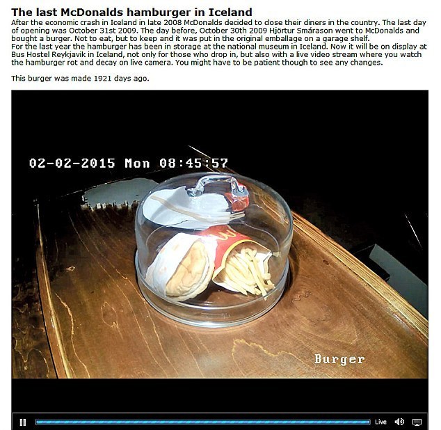 Житель Исландии Хертур Смарасон (Hjörtur Smárason) показал чизбургер и картофель фри, которые он купил 30 октября 2009 года в одном из ресторанов McDonald’s в последний день работы сети в стране. Рестораны McDonald’s прекратили работу в Исландии из-за экономического кризиса.